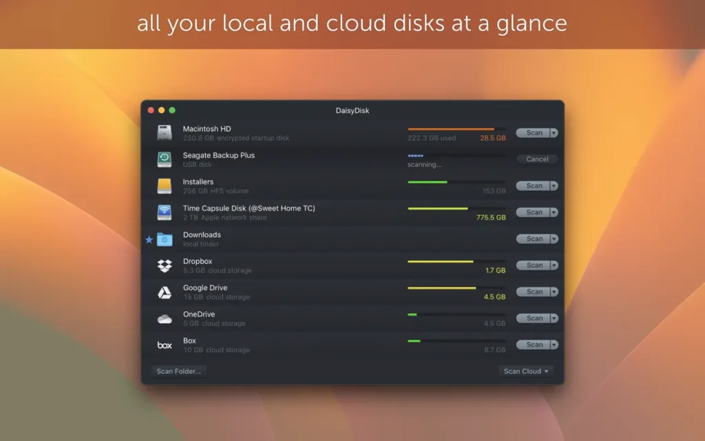 DaisyDisk là một trong những phần mềm phân tích và dọn dẹp dung lượng ổ cứng trực quan – chính xác – nhẹ máy nhất dành cho người dùng macOS. Chỉ với một lần quét, bạn có thể nhanh chóng phát hiện các tệp chiếm nhiều dung lượng và giải phóng bộ nhớ Mac hiệu quả.