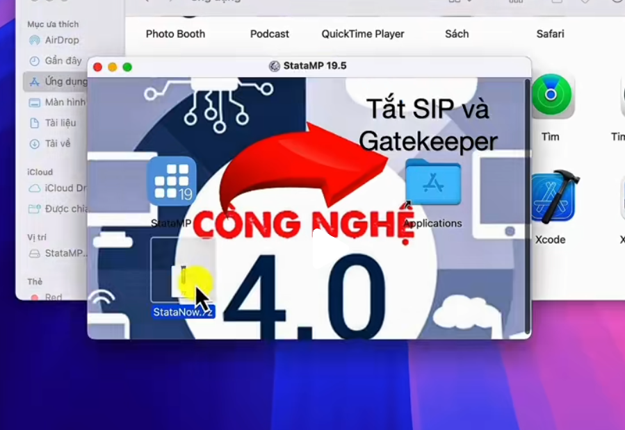 + gõ tiếp lệnh này trong Terminal: xattr -cr(dấu cách) – mở thư mục StataNow – kéo app StataMP vào terminal rồi enter.